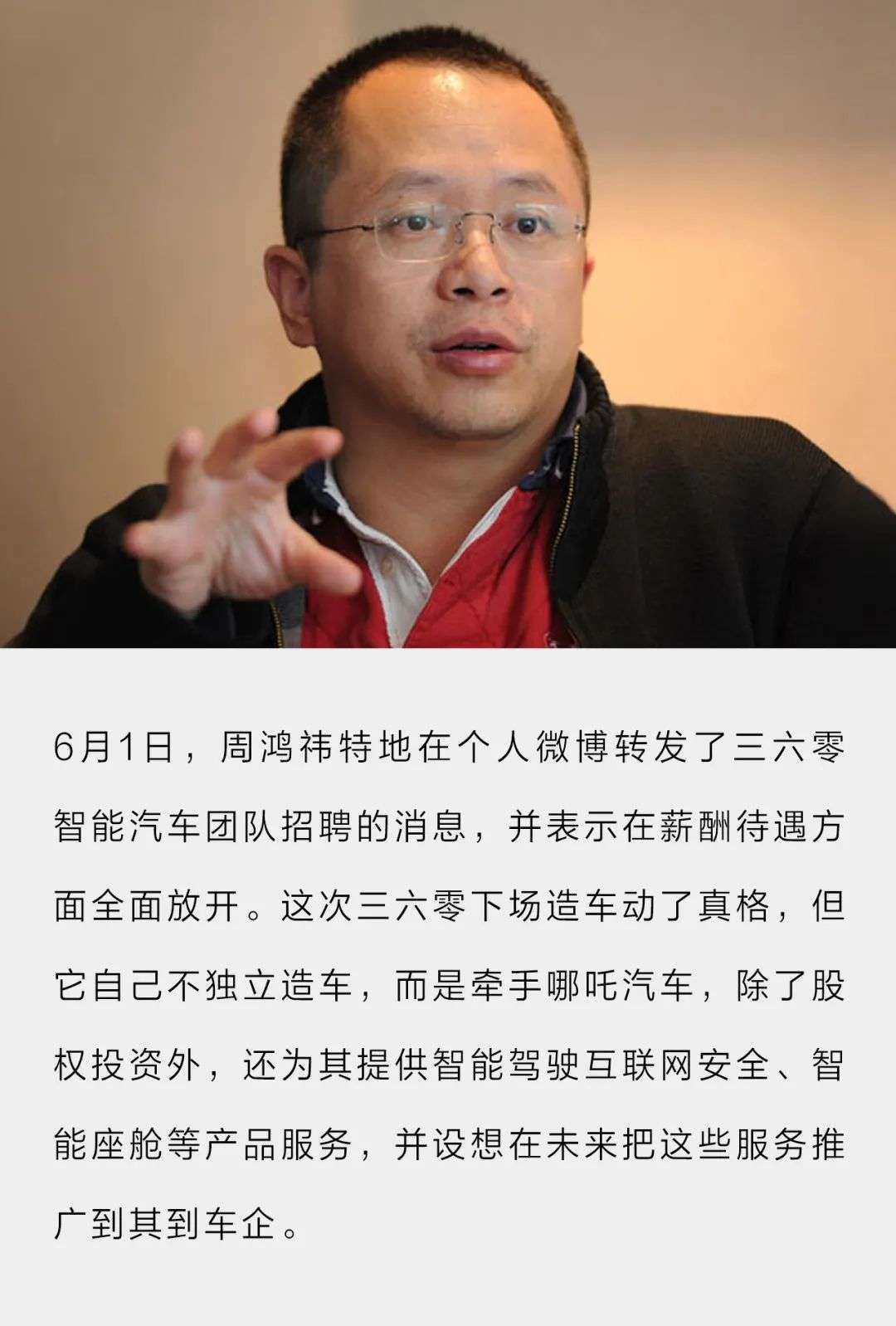 4月26日,三六零公司领投了哪吒汽车的D轮融资;5月11日,三六零召开三六零集团智能汽车战略媒体沟通会,周鸿祎宣布其将正式成为哪吒汽车的产品经理,并表示“我们选择的是联合造车,而不是自己造车。希望通过互联网对传统汽车进行基因重组,编辑出全新的智能汽车基因”。