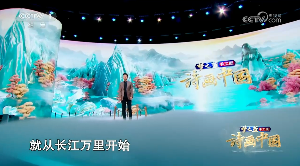 新一季《诗画中国》围绕“江河万古流”这一主题,以书写大江大河的诗画为线索,通过新技术手段和鲜活的表达,让经典画作不断“活起来”。首期节目中,《长江万里图》卷、《江汉揽胜图》轴、《蜀川图》卷、《庐山高图》轴四幅画卷徐徐展开。开卷人陈铎、许嵩、曾黎、张桐与主持人撒贝宁携手,一起用诗画丈量山海纵横,带领观众共同领略千年中华之美。《长江万里图》卷是明代画家吴伟创作的绢本墨笔画,现藏于北京故宫博物院。《诗画中国·江河万古流》的首个舞台带观众由此“入画”,品味画卷中的万里长江。开卷人陈铎化身画中的行者娓娓道来,带领观众跨越时空感受长江水韵文脉。在宜昌市委宣传部支持下,青年舞蹈演员郑南与湖北三峡演艺集团的舞蹈演员们于长江岸侧进行实景拍摄,化舞蹈为诗画的语言,勾勒出自在奔流的浪漫意象。