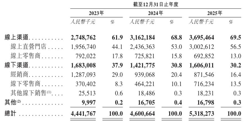 最近几年,自然堂的线上渠道占比逐步上升。从2023年的61.9%提升至2025年的69.5%,其中线上直营门店成为绝对主力,占比由44.1%增至56.5%;而线上零售商(如分销平台)份额则从17.8%压缩至13.0%。