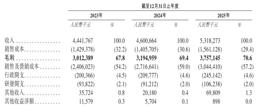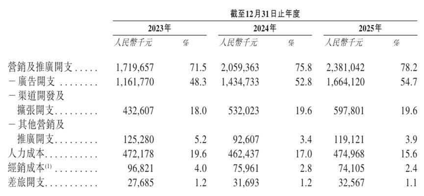 营销及推广开支是绝对的主力,且在销售及营销成本中的占比还在持续攀升。从2023年的71.5%升至2025年的78.2%。这笔开支2023年为17.20亿元,到2025年已膨胀至23.81亿元,两年间增长了38.4%。