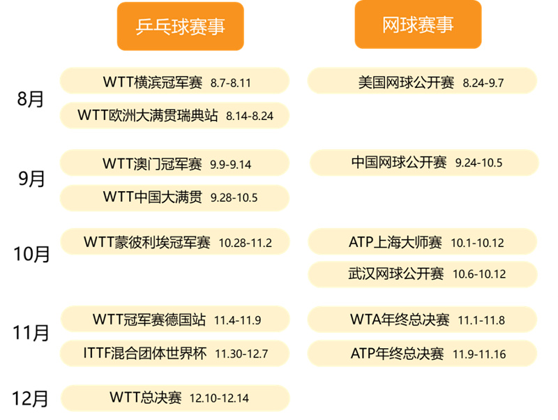 在这个炎炎夏日,WTT美国大满贯与温网赛事为观众奉上了极致的体育盛宴。进入下半年,网球与乒乓球更多重量级赛事整装待发。其中乒乓球赛事包括WTT横滨冠军赛、WTT中国大满贯、ITTF混合团体世界杯、WTT总决赛等;网球赛事包括美国网球公开赛、中国网球公开赛、WTA年终总决赛、ATP年终总决赛等。