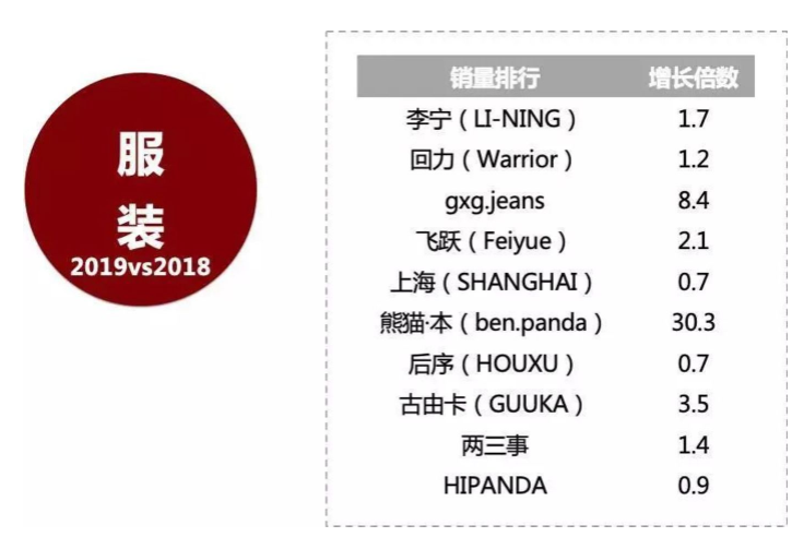 但是特别值得关注的,以潮⽂化休闲⻛为主轴的熊猫·本,增⻓⾼达 8 倍,份额排名第 6。⽽ GXG 的副牌主打潮流时尚的 GXG Jeans 增⻓⾼达 8 倍,成为时装类的鳌头,紧跟在两⼤品牌李宁与回⼒之后。