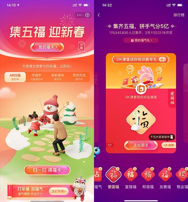 阿里巴巴今年的新春红包活动依然是多年以来的常规节目“集五福”,用户在支付宝的主界面就能看到集五福的入口,非常明显。用户可以通过“AR扫福、写福字、蚂蚁森林、芭芭农场”四种活动方式获得相应的福字,其中“沾福气”和“万能福”卡片玩法得以保留。