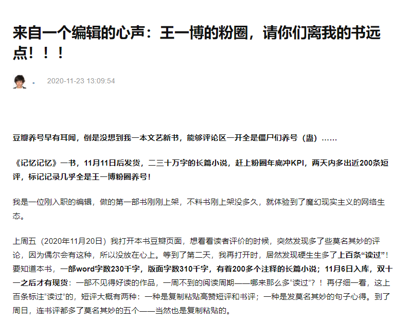 “请你们离我的书远点!”2020年11月,一位图书编辑控诉称,自己编辑的一部新书刚在豆瓣上架,就被“注水”大量评论。“两天内多出近200条短评,标记记录几乎全是艺人王一博粉圈养号!”