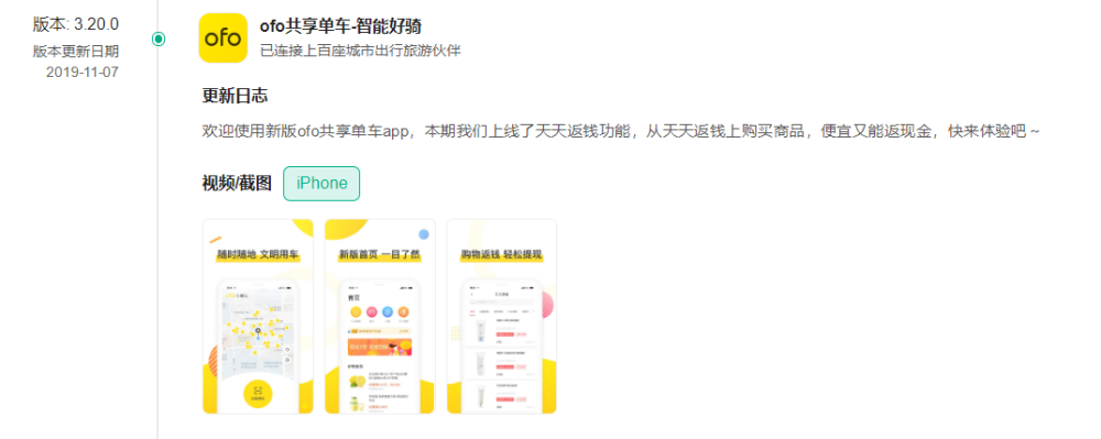ofo APP2019年11月上线“天天返钱”功能,图源七麦数据