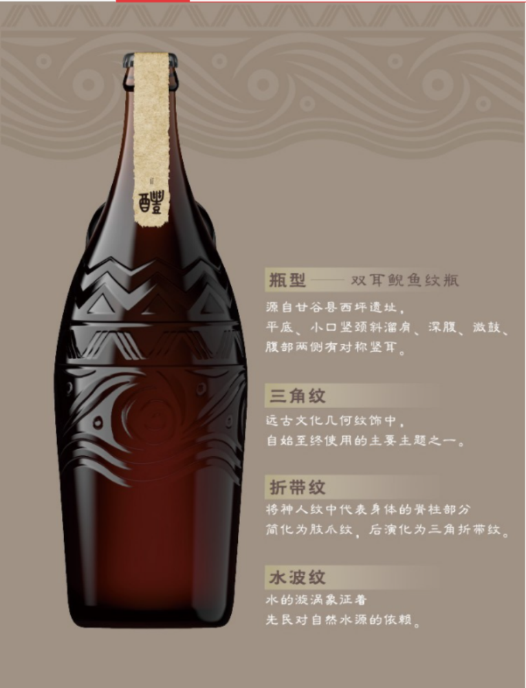 反而花费了大量笔墨用以描述啤酒瓶身的高端之处,例如,啤酒瓶型采用了双耳鲵鱼纹的设计,瓶身采用了三角纹、折带纹以及水波纹等等一系列的描写。甚至同时附送的杯垫+开瓶器,以及两支以青铜觯为原型玻璃酒杯,这些都有各自相应的讲究。
