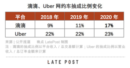 图注:滴滴的抽成比例逐渐接近更早商业化的 Uber
