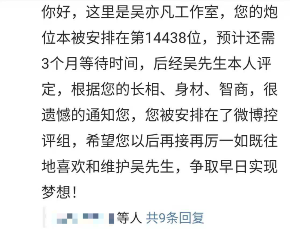 路人则有两套复制粘贴的模板。一套是以吴亦凡工作室名义通知博主落选,一套是通知入选,非常笋。