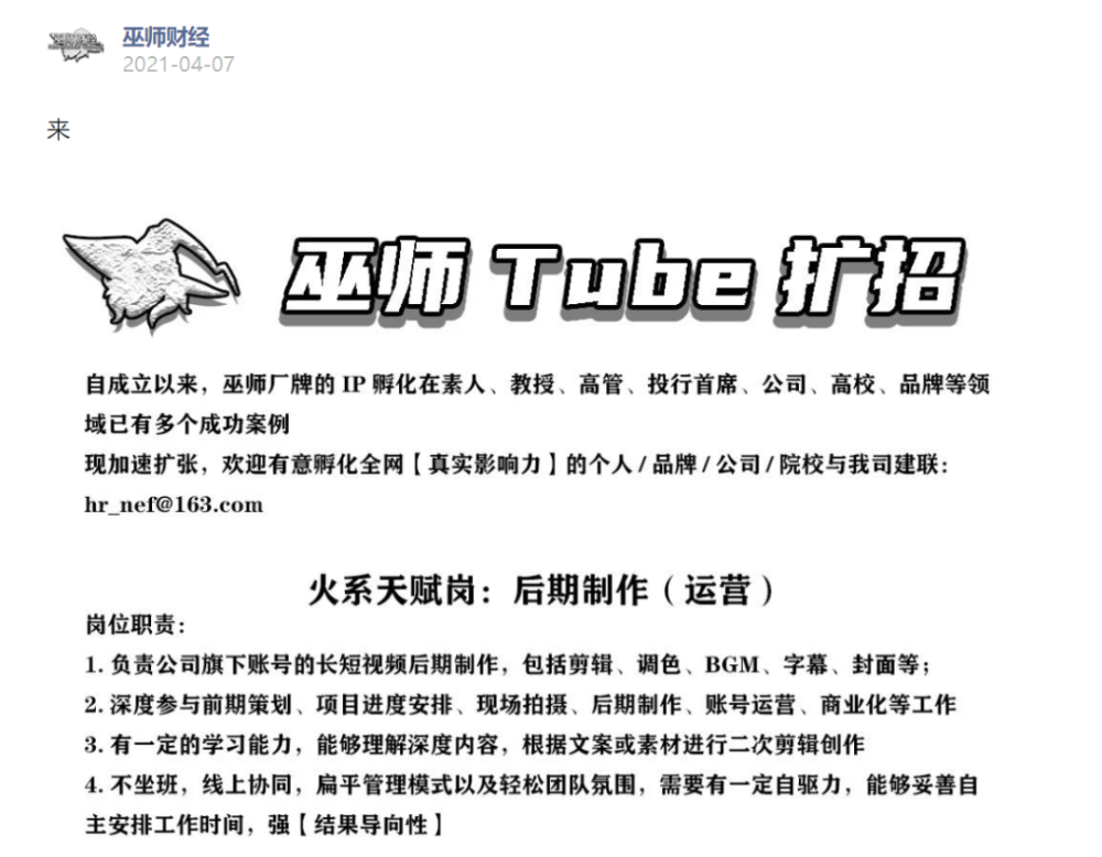 但从西瓜视频上巫师财经的更新频率来看,一年多的招募似乎并没有给账号注入活力,月更甚至更长时间的间隔显得与速朽短视频浪潮格格不入。