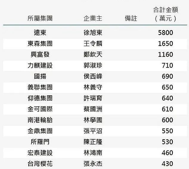 苏贞昌的“子弟兵”吴秉叡,获远东集团下属的远扬建设捐赠100万元新台币;张宏陆,获远银资产管理捐赠100万元新台币。