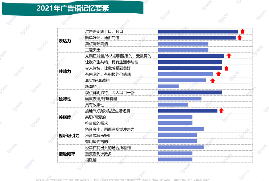 根据益普索Ipsos《引爆记忆广告语盘点》,从消费者对TOP10热门、高辨识、占据心智的广告语的记忆分析,深耕消费者生活场景的内容对品牌记忆效果更好。大多数被引爆的品牌依然通过线上线下多渠道整合的途径进行传播,电梯媒体对广告语记忆效果尤为突出,其次是互联网。TOP10 热门/高辨识/占据心智的广告语中,84%消费者记忆渠道源于电梯媒体,69%源于互联网媒体,50%源于电视广告。