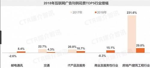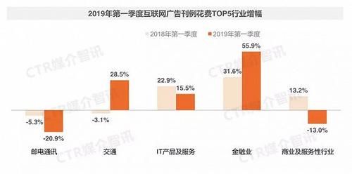 据CTR数据显示,在2018年年度互联网广告刊例花费前五的行业中除了邮电通讯和商业及服务性行业,其它行业都出现增长下滑的情况。而2019年Q1互联网广告花费前五名是金融(替换了房地产/建筑工程行业)、IT产品及服务(电商 游戏)、交通、商业服务及服务性行业、邮电通讯。其中邮电通信、IT产品及服务和商业及服务性行业三个行业的互联网广告刊例花费出现明显下滑,邮电通讯和商业及服务性行业表现尤为明显。