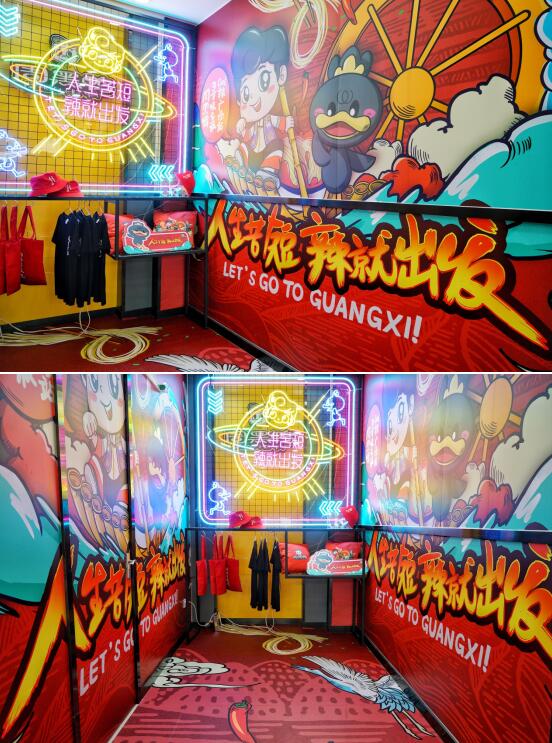 记者在现场看到,整个门店以热烈的中国红为主色调,加上“人生苦短辣就出发”八个大字,隐约透出周黑鸭的活力与酷辣。海报上除了周黑鸭和周氏惊喜官小周周的卡通形象外,仙鹤、祥云、中国山水等传统国风元素,极具诗情画意与国潮魅力。门店还配置不少定制周边,包括T恤、帽子、帆布袋、抱枕等,可供会员打卡拍照。据了解,此次特色主题门店的设置,主要是为周黑鸭寻味系列活动第三季——“周黑鸭寻味cool辣广西之旅”进行宣传。