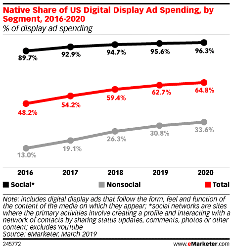 在社交网站的推动下,原生广告占展示广告支出的近2/3。