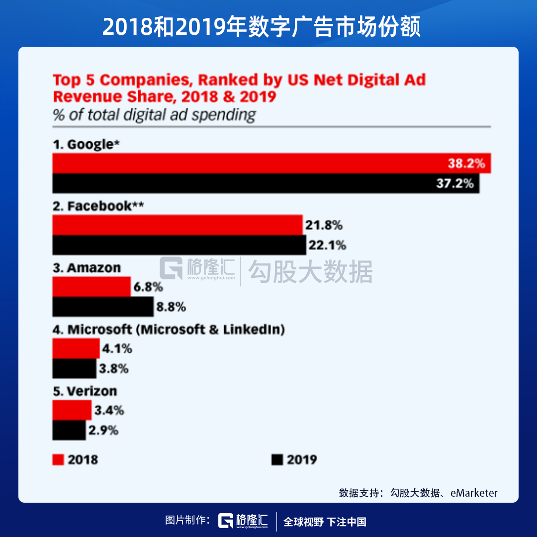 过去几年,Facebook高于行业的增长,主要是因为他能搜索广告上抢到了更多的市场份额。从市场份额上看,2019年Google的市场份额为37.2%,Facebook的市场份额22.1%。谷歌的市场份额在减少,Facebook和亚马逊的市场份额在增加。