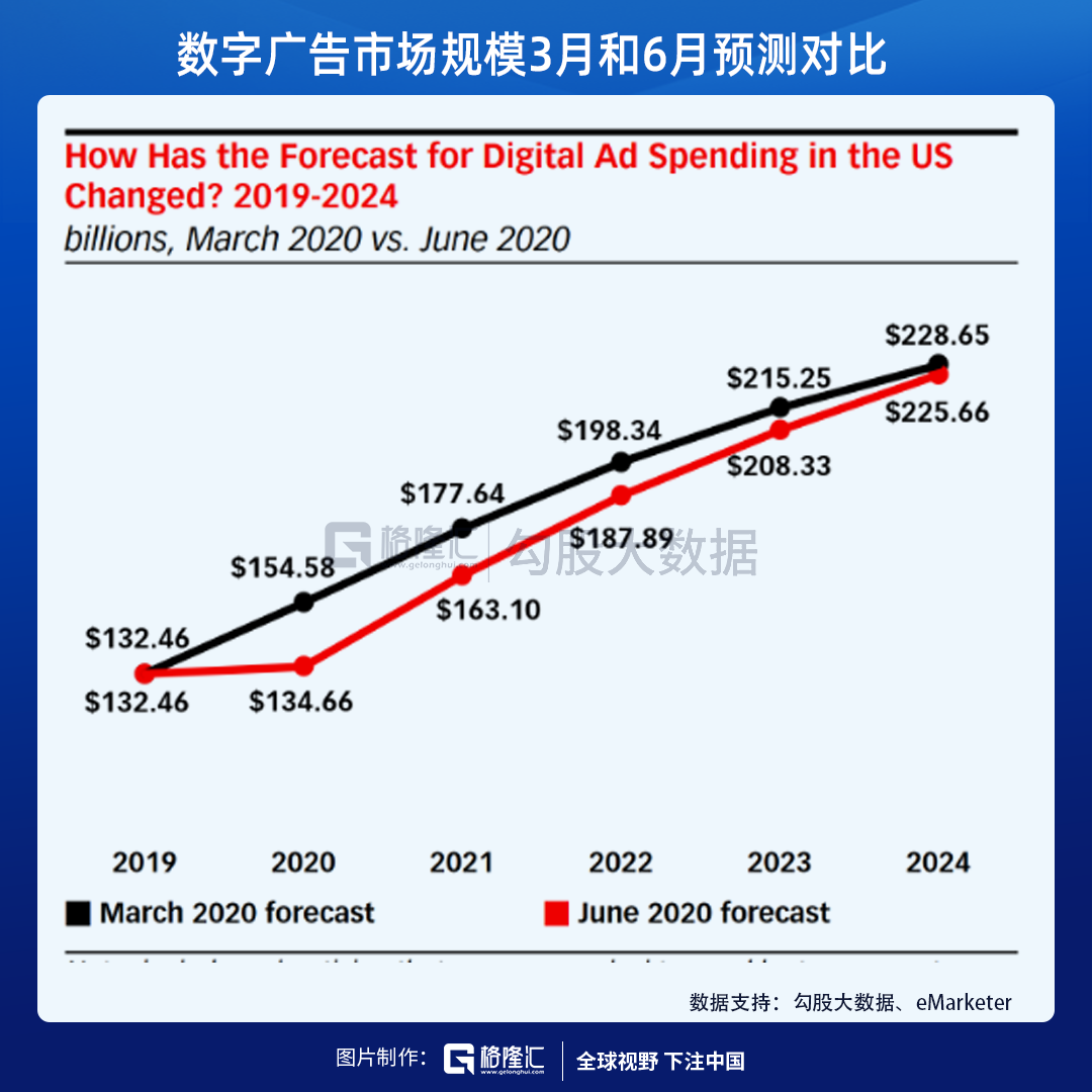 所以虽然疫情在短期上对广告行业打击巨大,但eMarketer认为在2024年将会达到之前的预期水平,俗语说就是短期波动不该长期逻辑。