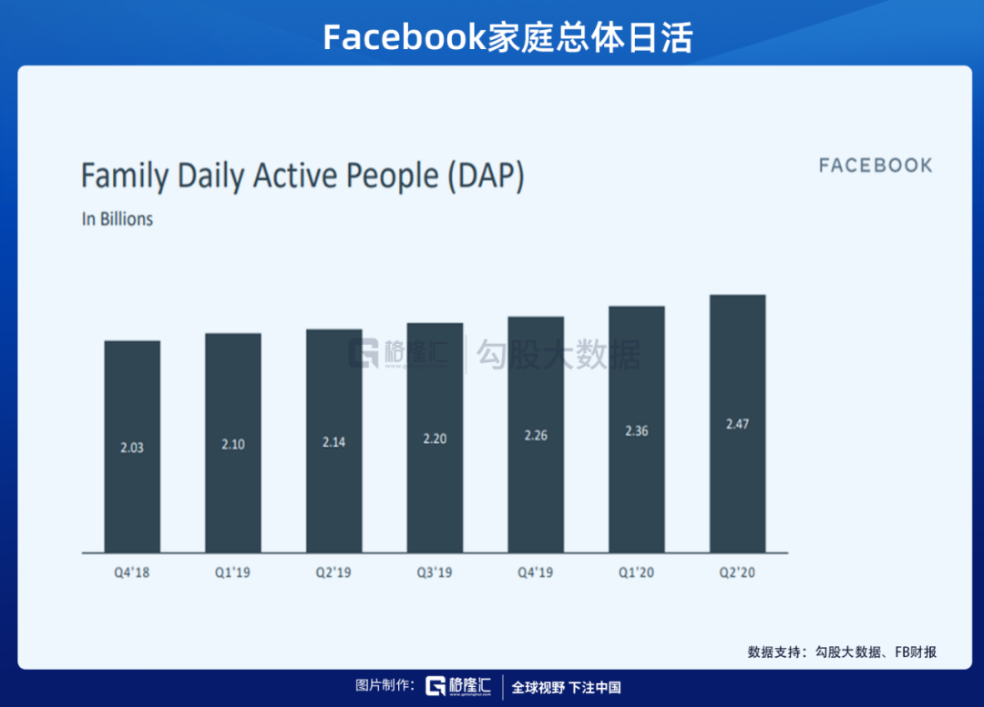 截止到2020年Q2,FB旗下四款软件全球的月活人数31.4亿,同比增长13.7%;日活人数24.7亿,同比增长15.4%。