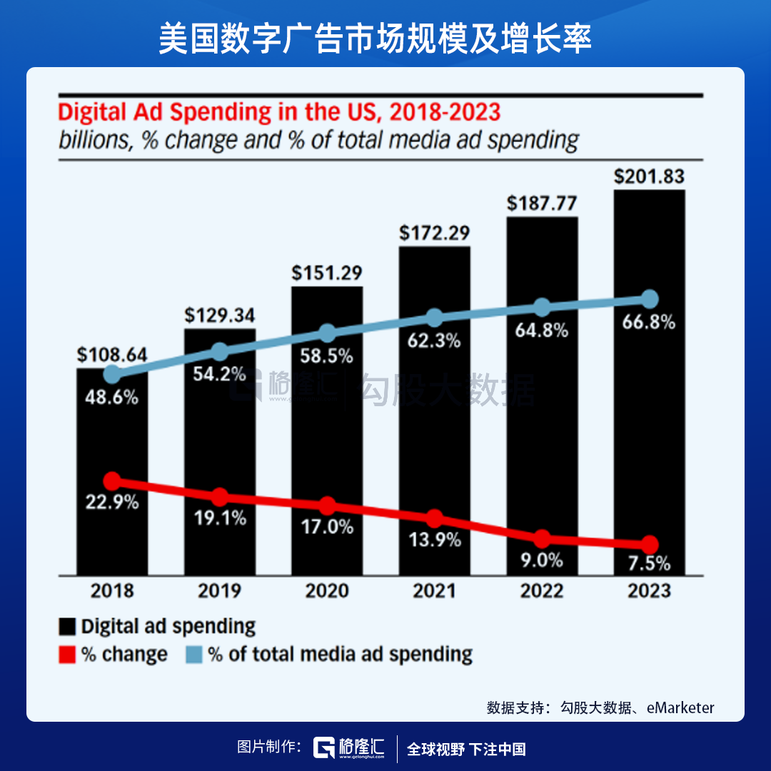 eMarketer在年初预测在2023年,数字广告规模将达到2000亿美元,渗透率上升至66.8%。所以整个市场的未来4年复合增长率为11.7%。