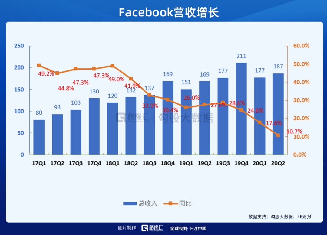 Facebook二季度财报很好地印证了这句话。在海外受疫情影响最严重的二季度,FB营收不但没有下降,反而上涨10.7%。