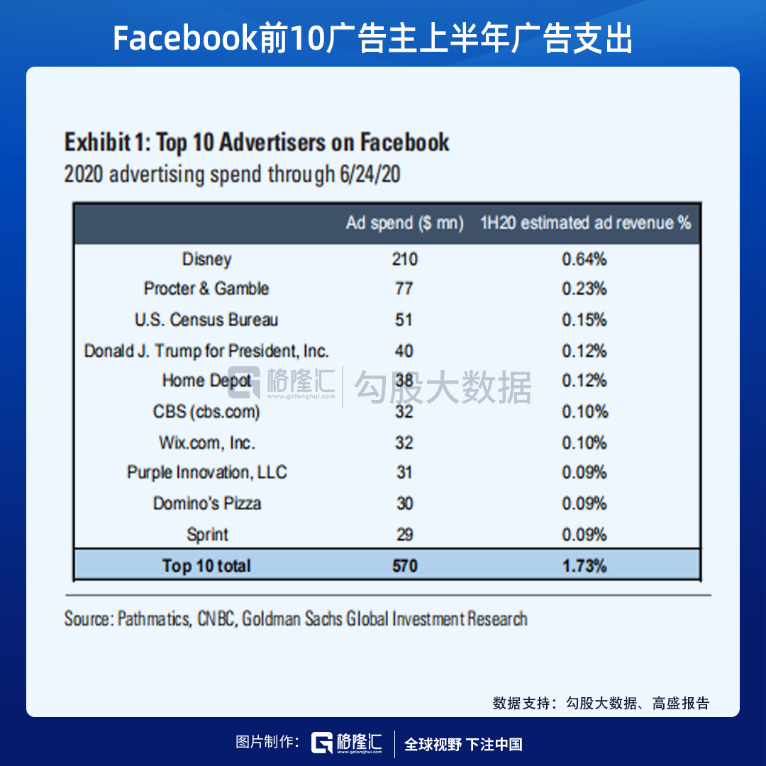 根据高盛的报告显示,前十广告主在2020上半年在FB平台上广告花费大约是5.7亿美元,占预期上半年总收入的1.73%。