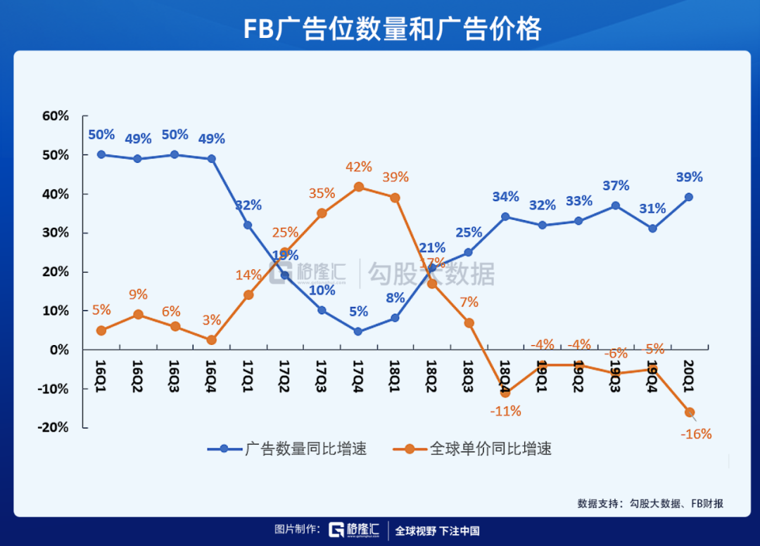 3、Q2 Facebook总体的广告位数量同比增长40%,弥补了疫情导致的广告平均价格下滑21%。