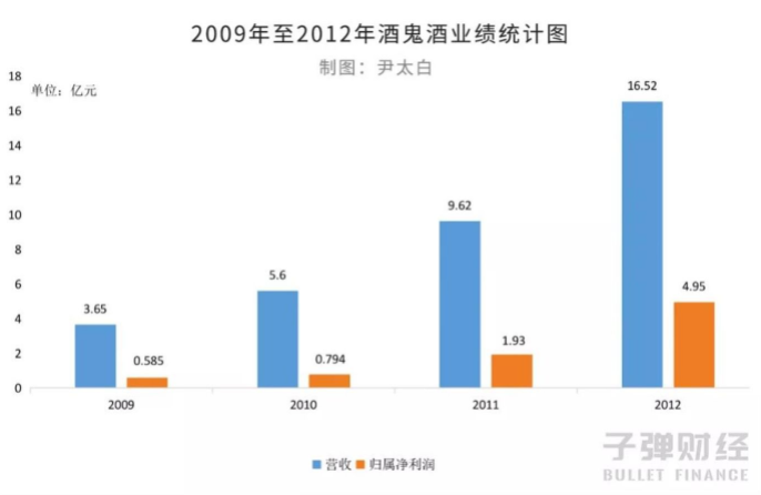 根据2009年至2012年年报,酒鬼酒在这四年中的总营收分别为人民币3.65亿元、5.6亿元、9.62亿元和16.52亿元,以此同时,净利润也大幅增长,分别为0.585亿元、0.794亿元、1.93亿元和4.95亿元。
