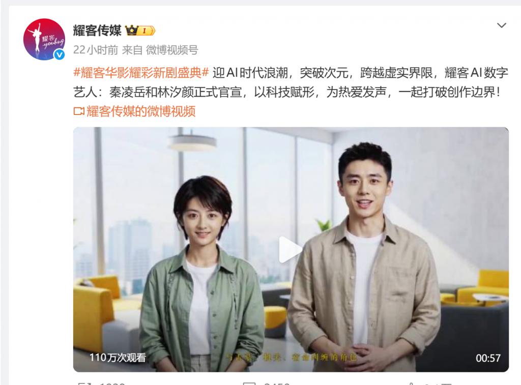 耀客传媒刚官宣了两位 AI 艺人,男的叫秦凌岳,女的叫林汐颜。