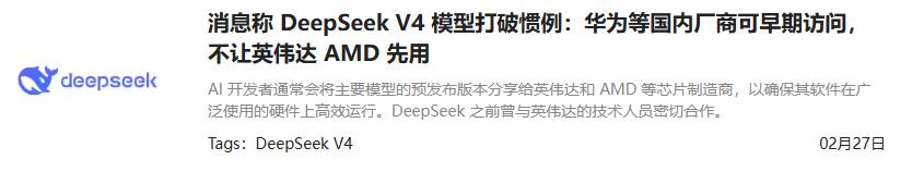 DeepSeek V4 在前期测试阶段,把早期访问和训练权限,优先提供给包括华为在内的芯片厂商。