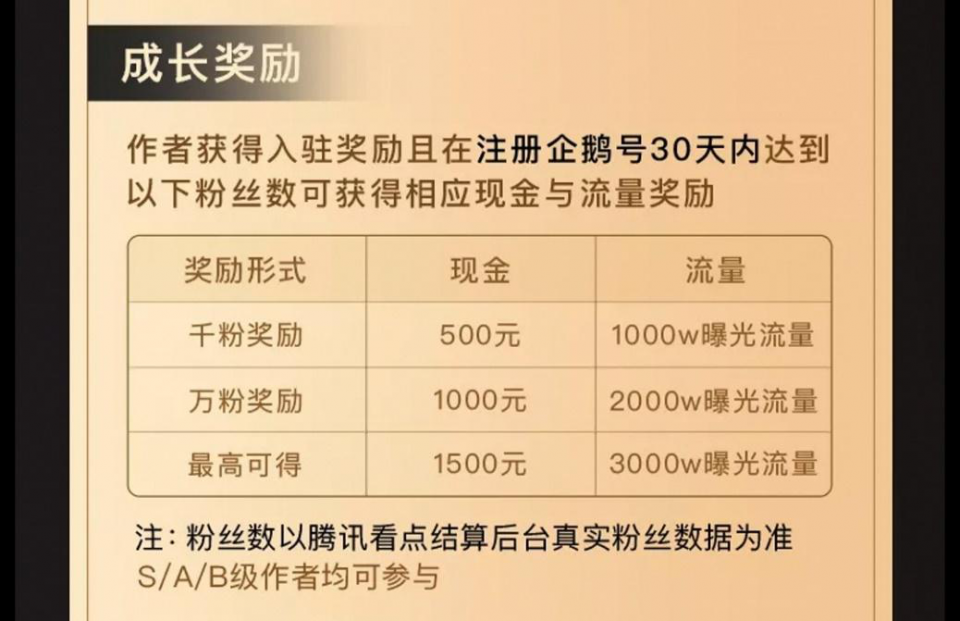 千粉奖励500元现金,1000万曝光流量;首月达到万粉还可再获得1000元现金,2000万曝光流量,每个账号最高可累计得1500元现金,以及3000万曝光流量。
