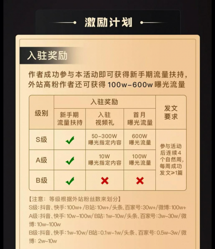 只要外站账号达到S级(账号等级划分具体见上图),入驻首月并参与活动即可获得600万曝光流量;外站账号达到A级,入驻首月并参与活动可获得100万曝光流量。