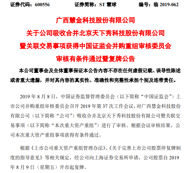 8月8日晚间,广西慧金科技股份有限公司(600556.SH,简称“ST慧球”)发布公告称,公司吸收合并北京天下秀科技股份有限公司(简称“天下秀”)暨关联交易事项获得证监会并购重组审核委员会审核有条件通过。8月9日,ST慧球复牌。
