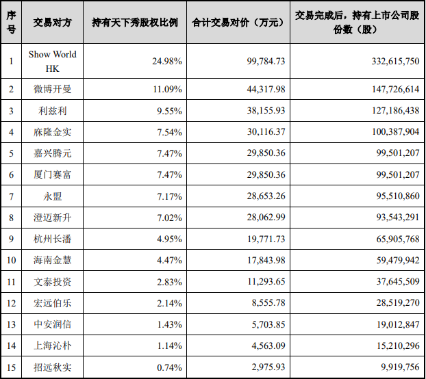 ST慧球公告显示,微博开曼持有天下秀7%的股份,秀天下香港持有27.47%。然而在层层股权穿透后,实际上新浪集团全资持有秀天下香港,并且持有74.9%的微博开曼股份,换言之新浪集团间接持有天下秀32.71%的股份。