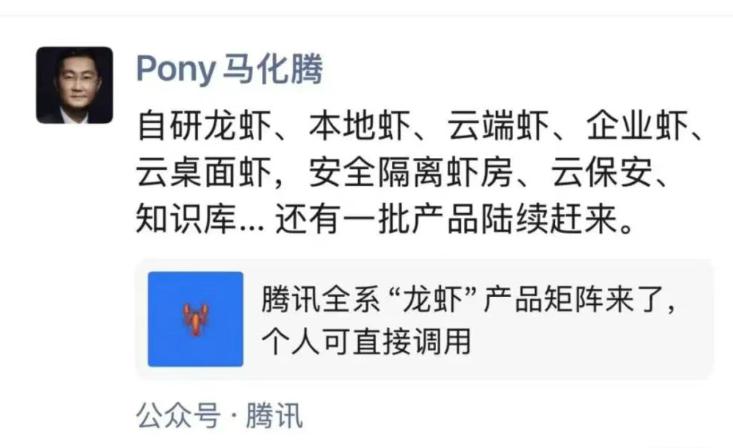 昨天凌晨,马化腾转发了一则《腾讯全系 " 龙虾 " 产品矩阵来了,个人可直接调用》微信推文,并表示:" 自研龙虾、本地虾、云端虾、企业虾、云桌面虾,安全隔离虾房、云保安、知识库 …… 还有一批产品陆续赶来。"